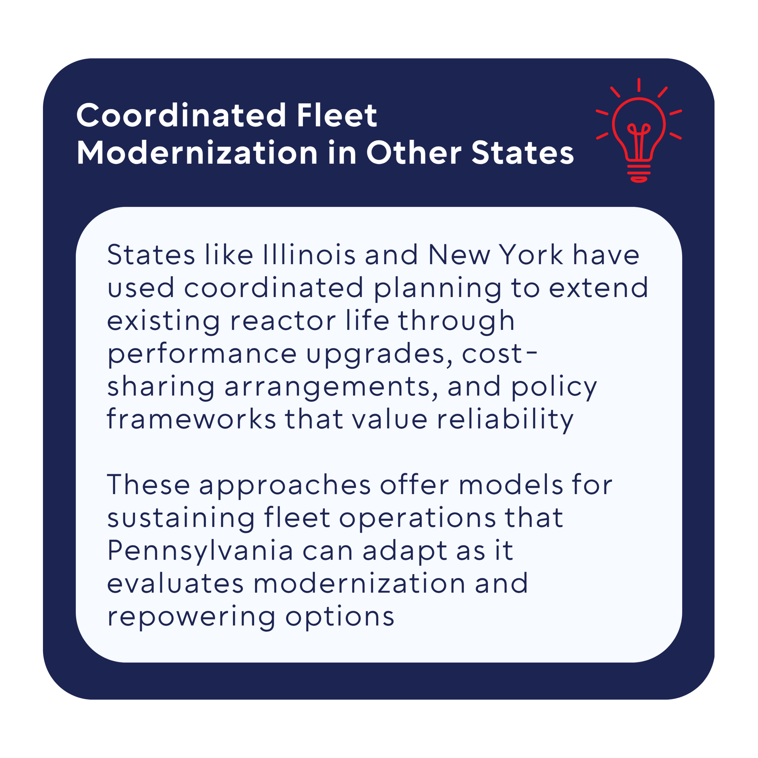 Nuclear energy is a cornerstone of Pennsylvania’s reliability and competitiveness, supporting the vision of a state that leads in energy security and long-term economic growth. Modernizing and sustaining the existing fleet is central to this strategy. Targeted upgrades can extend reactor life and performance well into 2050, while evaluations of potential repowering or restart opportunities can add capacity without the long lead time associated with new construction.