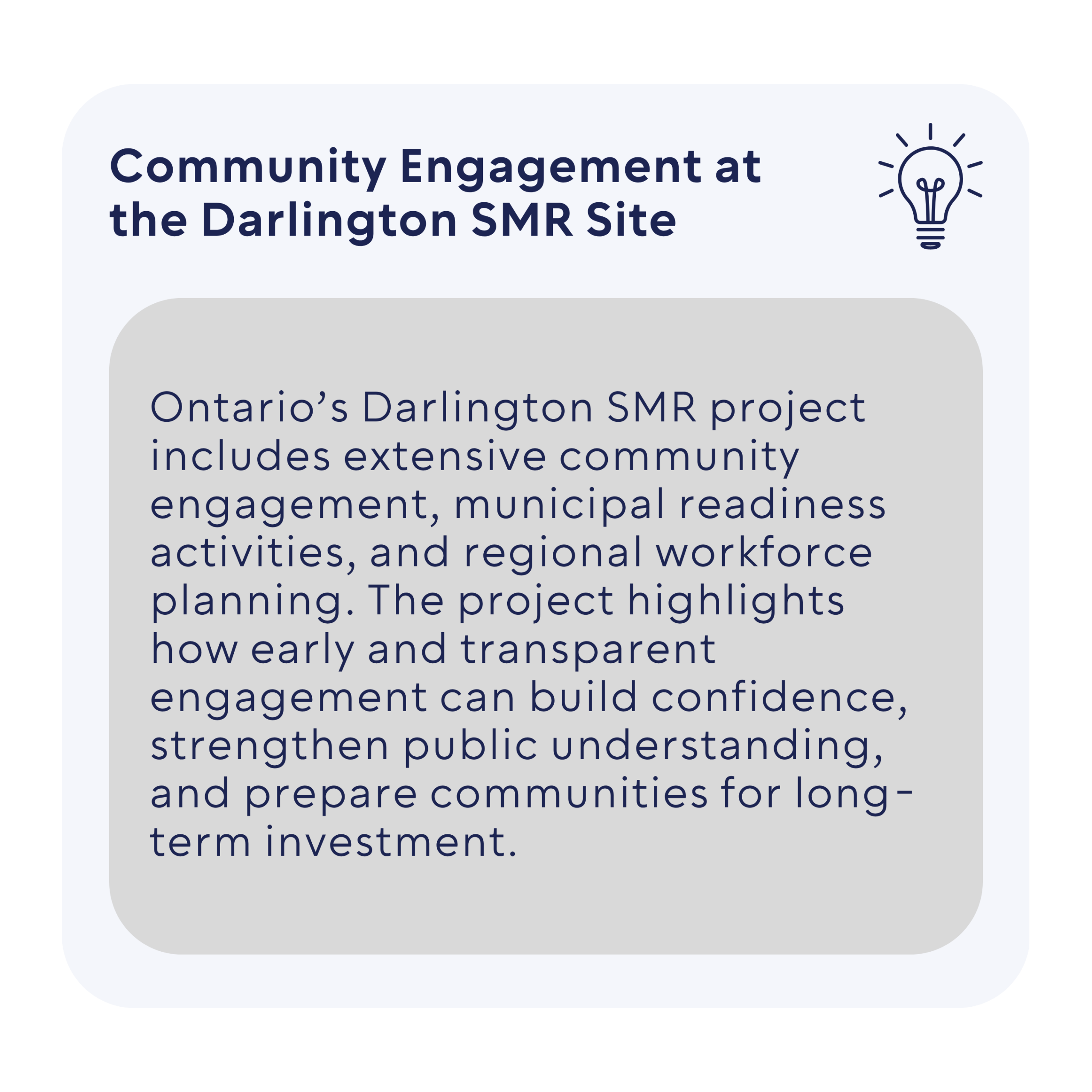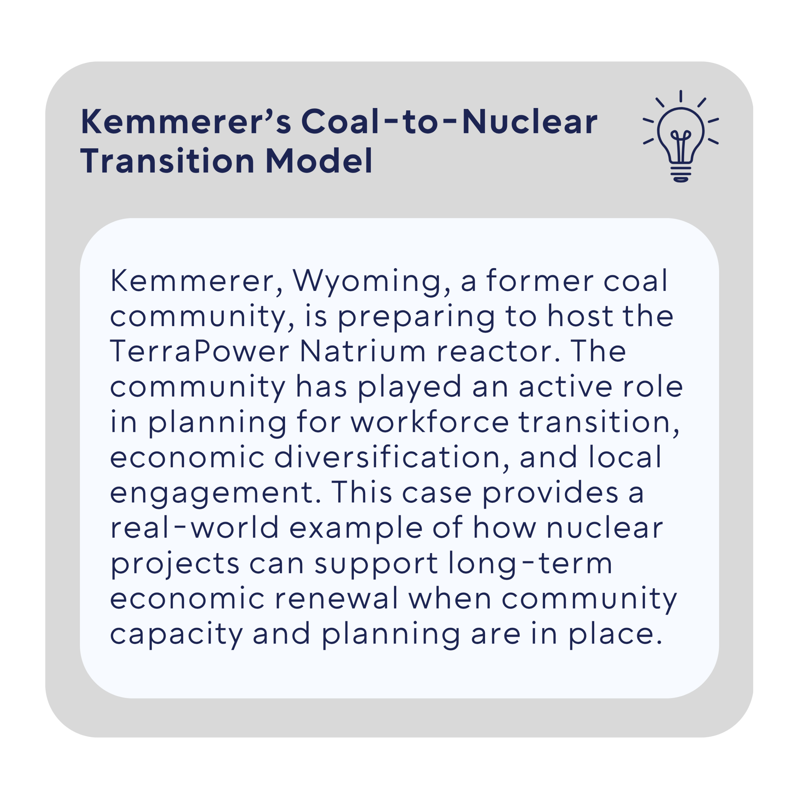 Communities play an active role in shaping how nuclear development unfolds. Local leaders must be able to evaluate opportunities, understand long-term implications, and participate meaningfully in early planning. When communities have access to practical guidance and trusted information, they are better equipped to navigate infrastructure needs and regulatory processes. That preparation leads to clearer expectations, more predictable siting decisions, and stronger confidence among residents and project partners alike.
