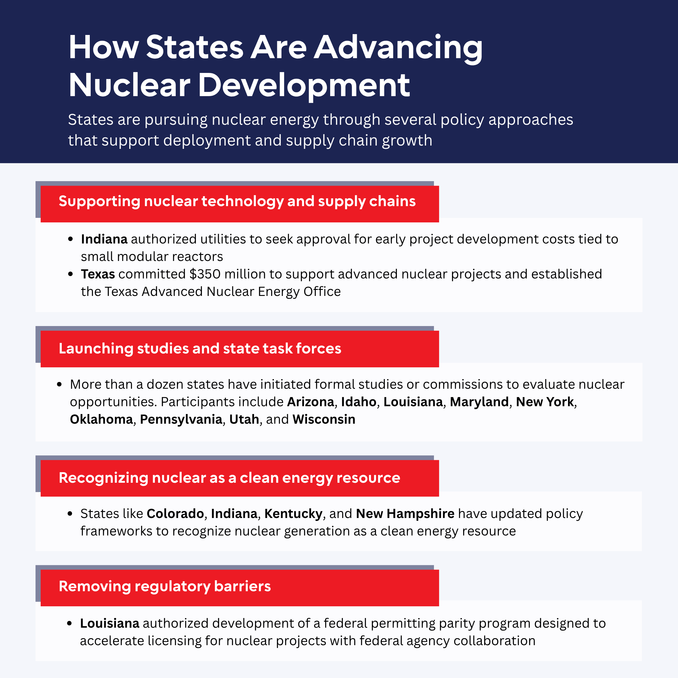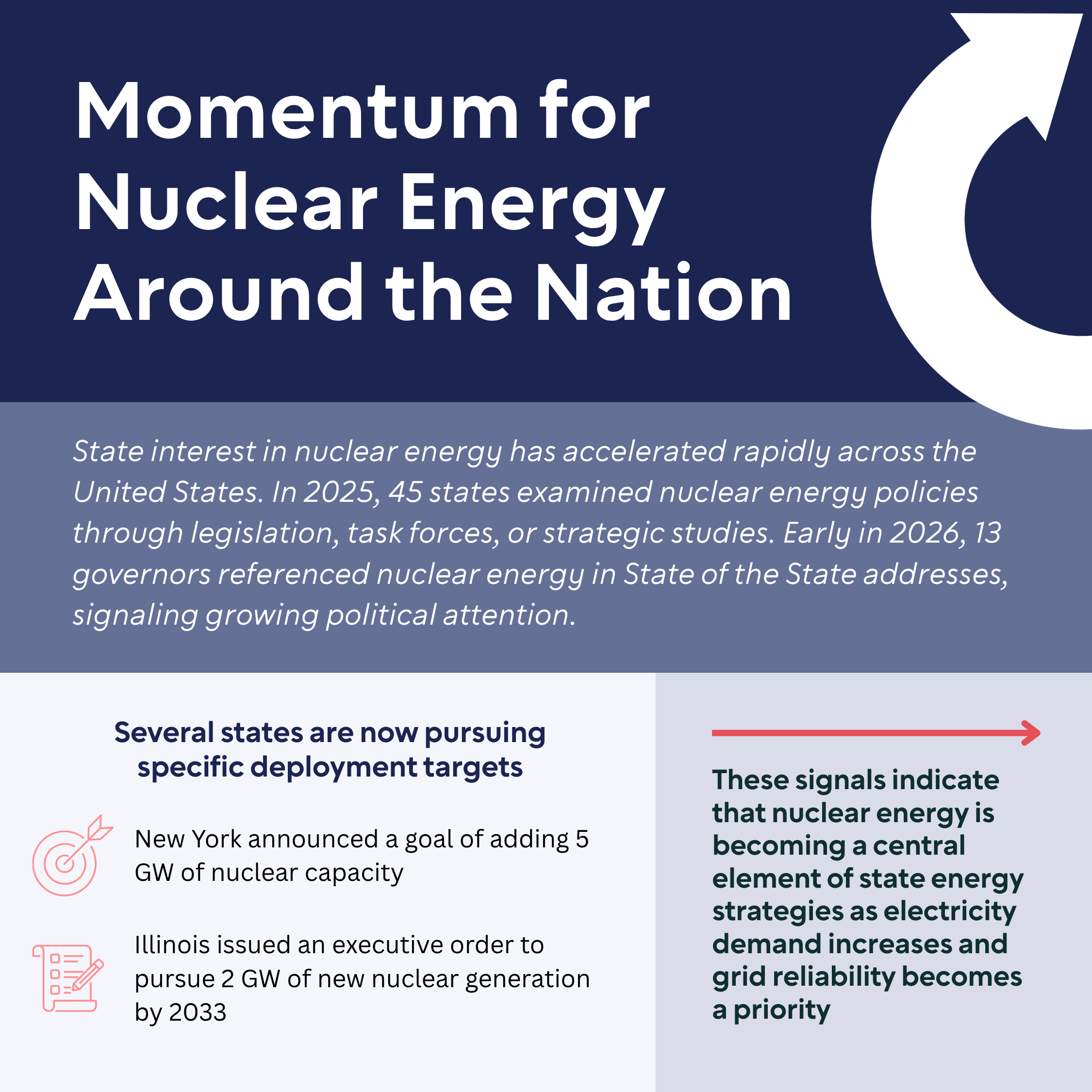 Electricity demand is rising for the first time in decades while federal policy, private investment, and state strategies are increasingly aligned around nuclear energy. At the same time, several states are moving quickly to position themselves for new projects and supply chain investment. These conditions create a narrow window in which states with existing nuclear industries can translate that foundation into long-term economic leadership.