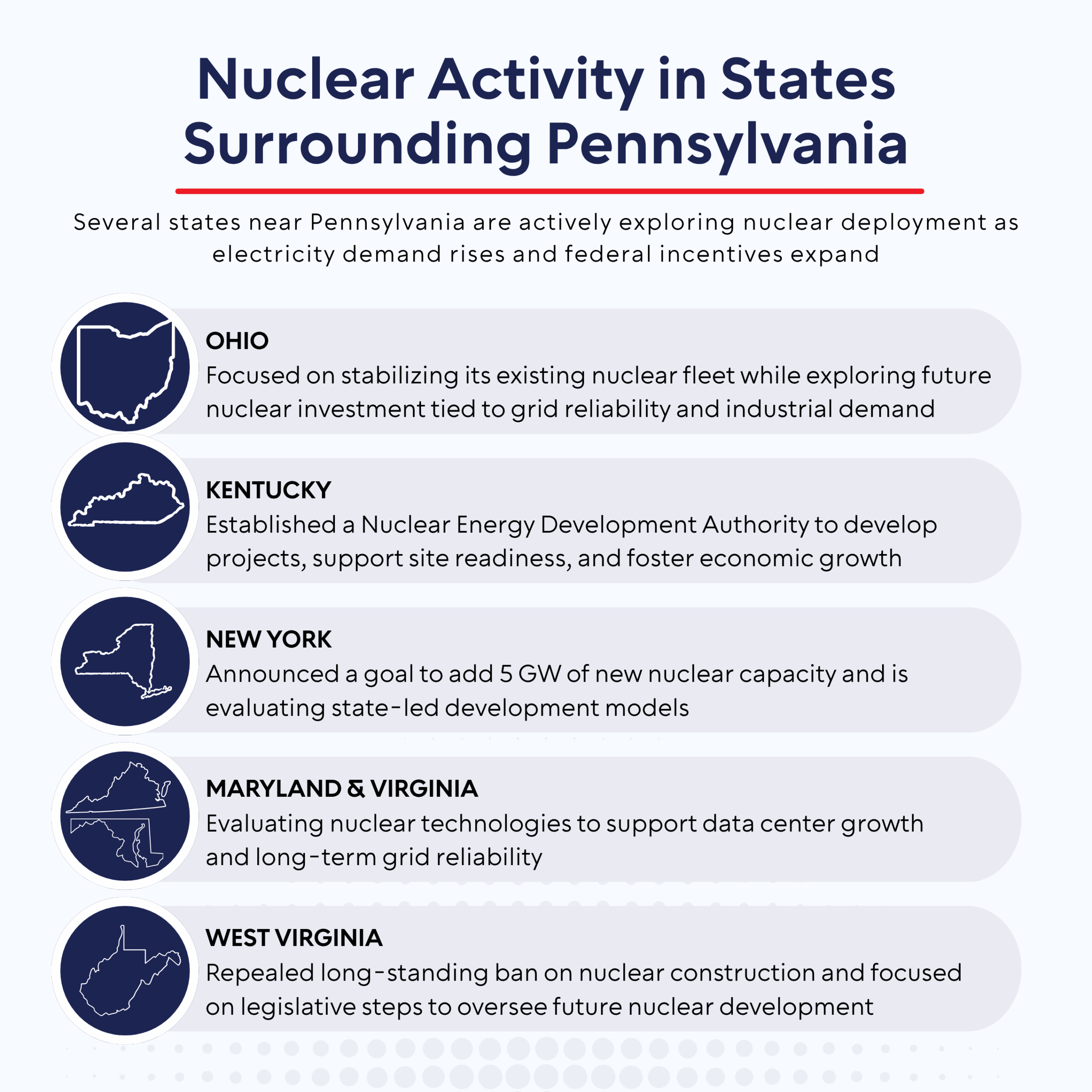 Nuclear energy development is accelerating across the Mid-Atlantic and Midwest. States surrounding Pennsylvania are advancing policies to sustain existing reactors and attract investment in new or additional nuclear capacity tied to rising electricity demand.